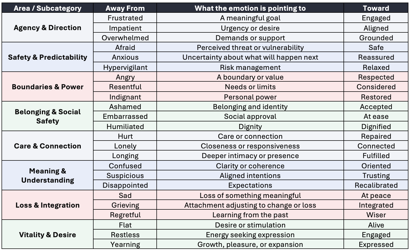 Say you feel resentful towards your partner. That’s clearly an ‘away from’ emotion. The question is, what are you feeling pushed away from? Take a look at the table below – resentment means you feel pushed away from ‘Needs or limits’. Which leads to the question “what are the needs or limits that you feel you’re being denied?”